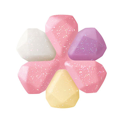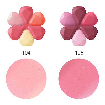 Оттенок 103 glow euphoric bouquet. Жемчужный и искрящийся, вдохновлен букетом из анемон и мимоз. Основная секция цвета (три лепестка из шести) — розовый тон, содержащий золотые, розовые и синие блестки. Также по одному лепестку белого, фиолетового и желтого цветов, плюс серебристые и зеленые блестки. Для полупрозрачных, ясных и блестящих губ.